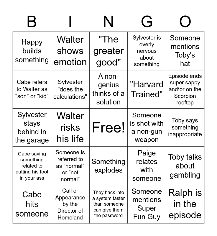 This bingo card has a free space and 37 words: Sylvester puts on hand sanitizer, Someone sings, Opening credits still going over 15min into episode, Sylvester "does the calculations", Toby talks about gambling, Someone is referred to as "normal" or "not normal", A non-genius thinks of a solution, "Kovelsky's", Someone mentions Toby's hat, Happy says "not good", Walter risks his life, Sylvester is overly nervous about something, Ralph is in the episode, Toby says something inappropriate, Cabe refers to Walter as "son" or "kid", Cabe saying something related to putting his foot in your ass, The team has to quickly improvise because something broke, "The greater good", Something explodes, Someone is shot with a non-gun weapon, Happy builds something, Episode ends super sappy and\or on the Scorpion rooftop, Cabe hits someone, They hack into a system faster than someone can give them the password, They leave the country, Someone mentions Super Fun Guy, Walter shows emotion, Megan is in the episode, or mentioned, Someone is held at gun point, Someone uses a Microsoft product, Cameo by a famous person, Call or Appearance by the Director of Homeland, Sylvester stays behind in the garage, There's a plane shown in the episode, Paige relates with someone, "Harvard Trained" and Someone points out that Cabe is old.