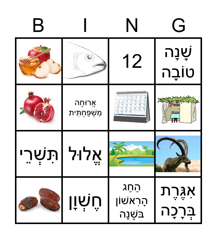 This bingo card has 9 images and 10 words: 12, אִגֶּרֶת בְּרָכָה, הַחַג הָרִאשׁוֹן בּשָׁנָה, תִּשְׁרֵי, אֱלוּל, אֲרוּחָה מִשְׁפַּחְתִּית, חֶשְׁוָן, בְּגָדִים חֲדָשִׁים וַחֲגִיגִיִּים, שָׁנָה טוֹבָה and יוֹם כִּפּוּר.