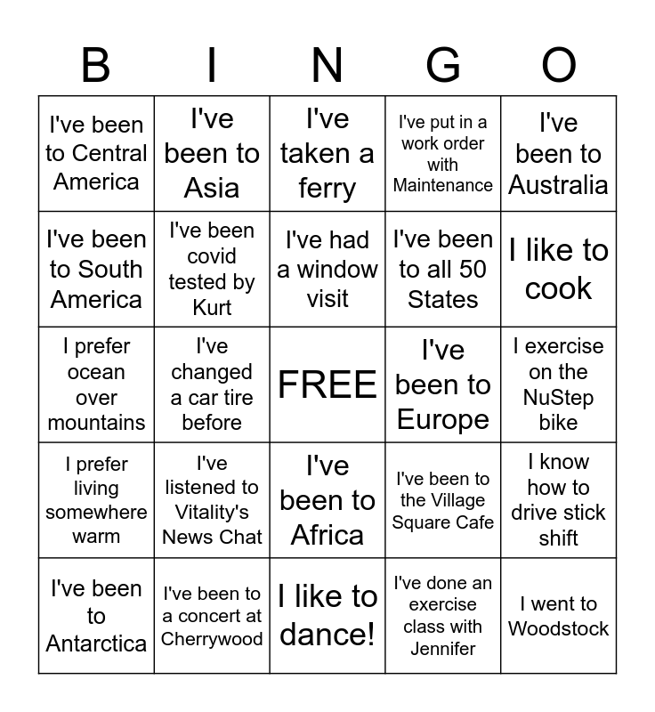 This bingo card has a free space and 24 words: I've listened to Vitality's News Chat, I've been to a concert at Cherrywood, I've had a window visit, I've been to Antarctica, I've been to Australia, I've been to Central America, I've been to South America, I've been to Asia, I've been to Europe, I've been to Africa, I've been to all 50 States, I prefer ocean over mountains, I've been to the Village Square Cafe, I know how to drive stick shift, I've been covid tested by Kurt, I've done an exercise class with Jennifer, I exercise on the NuStep bike, I've taken a ferry, I like to cook, I've changed a car tire before, I went to Woodstock, I prefer living somewhere warm, I've put in a work order with Maintenance and I like to dance!.