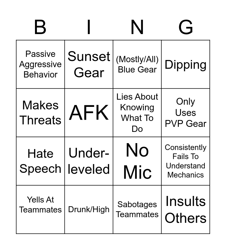 This bingo card has 16 words: Drunk/High, Consistently Fails To Understand Mechanics, (Mostly/All) Blue Gear, Passive Aggressive Behavior, Hate Speech, Sunset Gear, No Mic, Sabotages Teammates, Makes Threats, AFK, Yells At Teammates, Dipping, Under-leveled, Only Uses PVP Gear, Lies About Knowing What To Do and Insults Others.