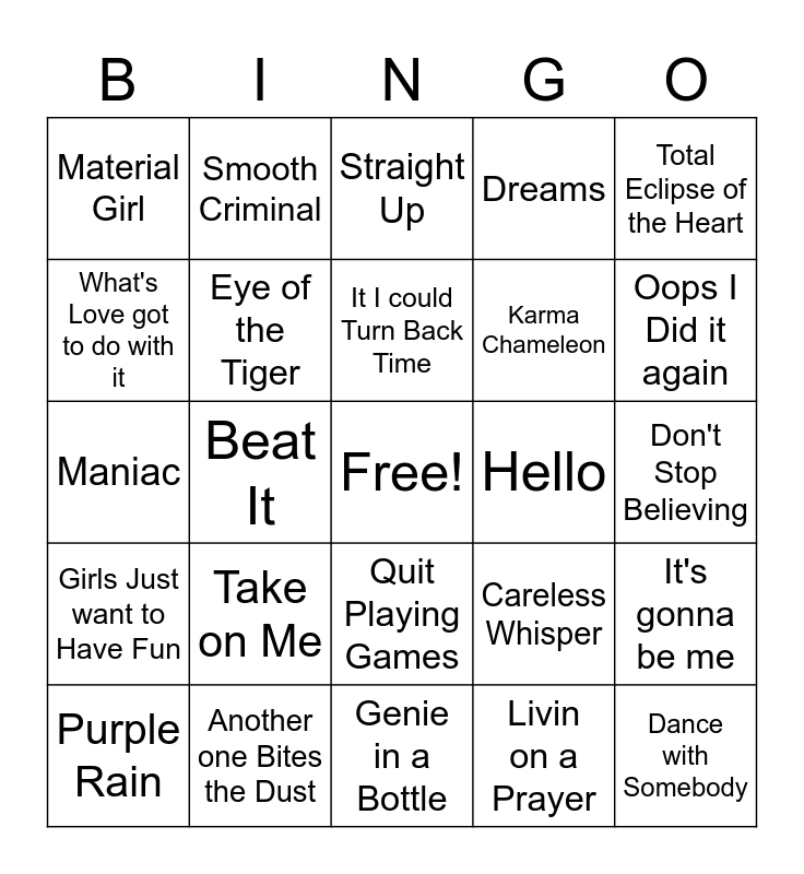 This bingo card has a free space and 24 words: Take on Me, Another one Bites the Dust, It I could Turn Back Time, Purple Rain, Total Eclipse of the Heart, Material Girl, What's Love got to do with it, Smooth Criminal, Hello, Quit Playing Games, Karma Chameleon, Maniac, Careless Whisper, It's gonna be me, Eye of the Tiger, Livin on a Prayer, Don't Stop Believing, Straight Up, Oops I Did it again, Beat It, Dance with Somebody, Girls Just want to Have Fun, Dreams and Genie in a Bottle.