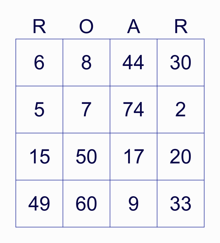 This bingo card has 1 images and 25 words: 1, 2, 4, 5, 6, 7, 8, 9, 14, 15, 17, 18, 19, 20, 28, 30, 33, 44, 49, 50, 53, 60, 68, 74 and 100.