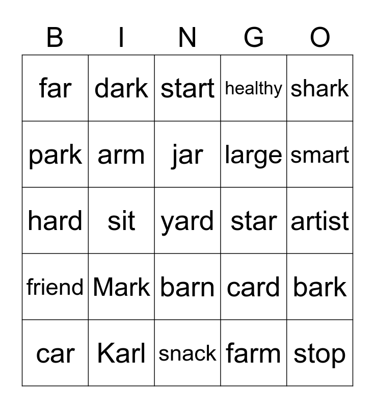 This bingo card has a free space and 24 words: Mark, Karl, jar, car, shark, far, park, dark, star, barn, large, hard, card, bark, arm, farm, artist, start, smart, sit, stop, friend, healthy and snack.