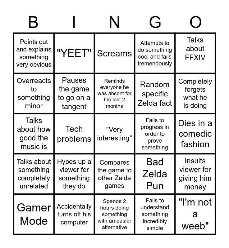 This bingo card has 25 words: Hypes up a viewer for something they do, Spends 2 hours doing something with an easier alternative, Reminds everyone he was absent for the last 2 months, Gamer Mode, Talks about FFXIV, Points out and explains something very obvious, Overreacts to something minor, "YEET", Fails to progress in order to prove something, Compares the game to other Zelda games, Random specific Zelda fact, Talks about how good the music is, Bad Zelda Pun, Insults viewer for giving him money, Pauses the game to go on a tangent, "I'm not a weeb", Dies in a comedic fashion, Screams, Completely forgets what he is doing, Tech problems, "Very interesting", Accidentally turns off his computer, Talks about something completely unrelated, Attempts to do something cool and fails tremendously and Fails to understand something incredibly simple.