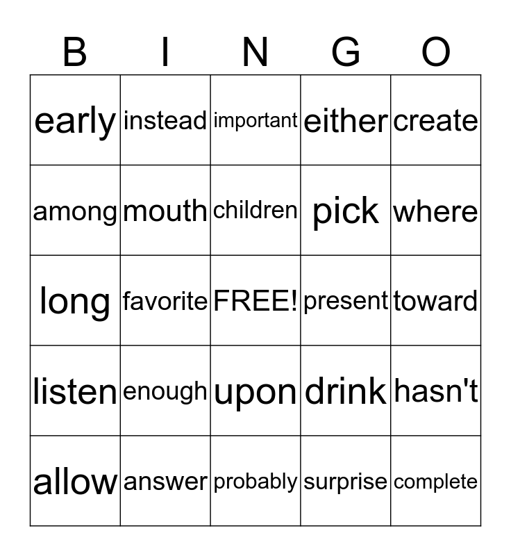 This bingo card has a free space and 24 words: enough, answer, children, allow, create, early, among, instead, present, upon, pick, long, drink, hasn't, mouth, surprise, toward, important, where, favorite, complete, listen, either and probably.