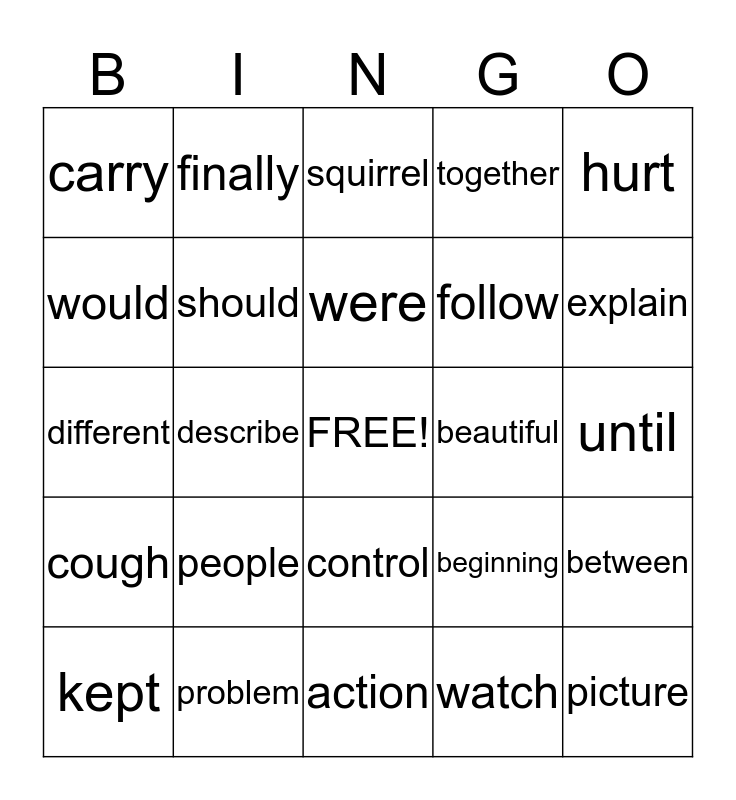 This bingo card has a free space and 24 words: people, problem, were, kept, hurt, carry, would, finally, beautiful, control, follow, different, beginning, between, should, watch, until, squirrel, explain, describe, picture, cough, together and action.