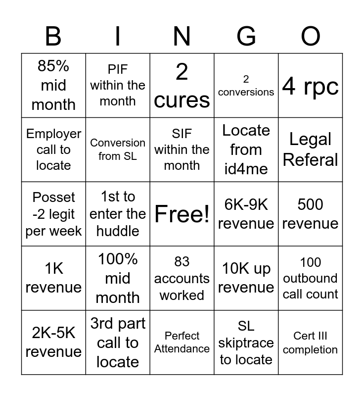This bingo card has a free space and 24 words: 100% mid month, 3rd part call to locate, SIF within the month, 2K-5K revenue, 4 rpc, 85% mid month, Employer call to locate, PIF within the month, 6K-9K revenue, 83 accounts worked, Locate from id4me, Posset -2 legit per week, 10K up revenue, 100 outbound call count, Conversion from SL, SL skiptrace to locate, 500 revenue, 2 cures, Legal Referal, 1st to enter the huddle, Cert III completion, 1K revenue, 2 conversions and Perfect Attendance.
