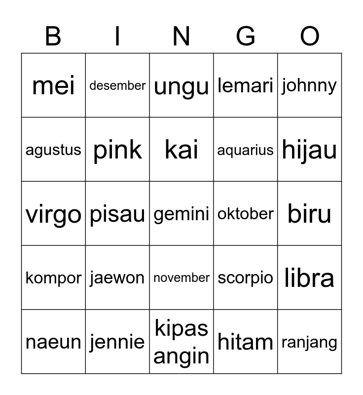 This bingo card has a free space and 24 words: jaewon, jennie, kai, naeun, johnny, mei, agustus, desember, oktober, november, aquarius, virgo, scorpio, libra, pink, hitam, biru, ungu, hijau, pisau, ranjang, kompor, lemari and kipas angin.