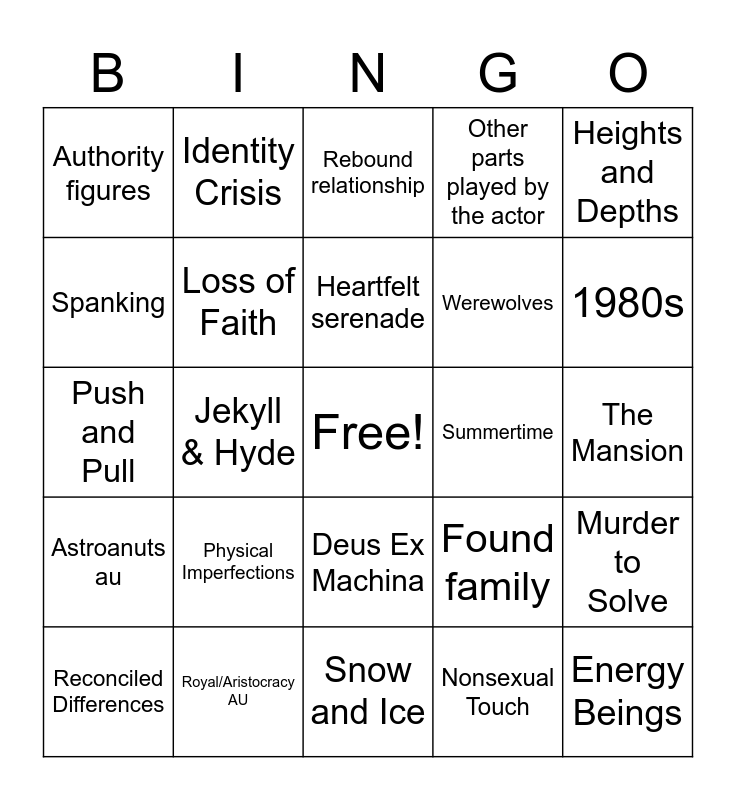 This bingo card has a free space and 24 words: Physical Imperfections, Royal/Aristocracy AU, Heartfelt serenade, Reconciled Differences, Heights and Depths, Authority figures, Spanking, Identity Crisis, Summertime, Deus Ex Machina, Werewolves, Push and Pull, Found family, Murder to Solve, Loss of Faith, Nonsexual Touch, The Mansion, Rebound relationship, 1980s, Jekyll & Hyde, Energy Beings, Astroanuts au, Other parts played by the actor and Snow and Ice.