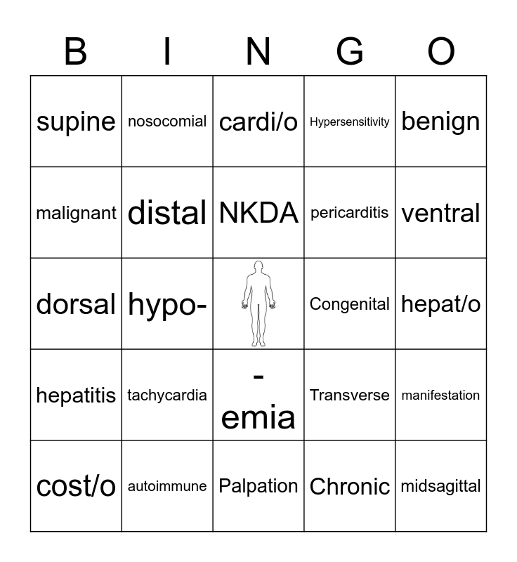 This bingo card has a free space and 29 words: cost/o, proximal, hypo-, umbilical, supine, cardi/o, distal, tachycardia, Congenital, autoimmune, hepat/o, midsagittal, Palpation, Chronic, ventral, Anatomical Position, -emia, hepatitis, benign, dorsal, Transverse, -itis, pericarditis, malignant, Hypersensitivity, nosocomial, manifestation, NKDA and WNL.