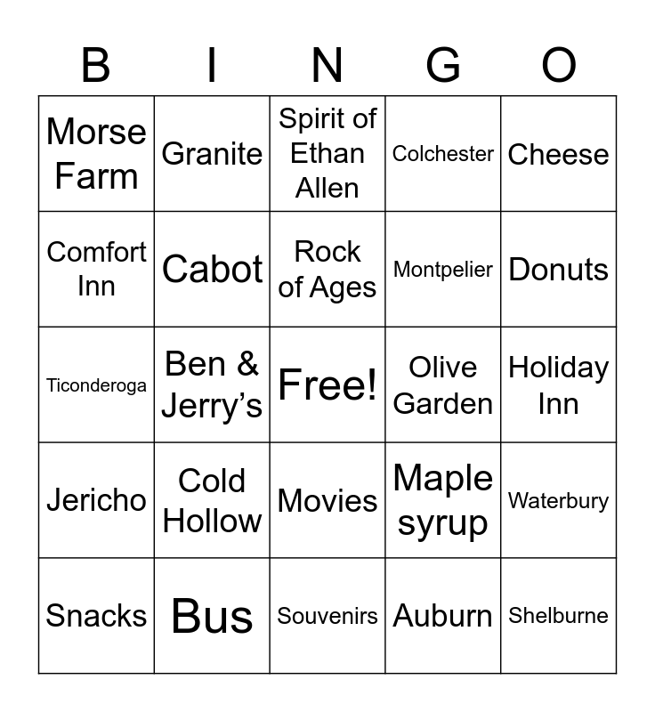 This bingo card has a free space and 38 words: Kroger, Lake Champlain, Mansfield Barn, Cabot, Waterbury, Cold Hollow, Rock of Ages, Graniteville, Cheese, Montpelier, Ben & Jerry’s, Colchester, Shelburne, Holiday Inn, Comfort Inn, Jericho, Best Western, Spirit of Ethan Allen, Stowe, Olive Garden, Morse Farm, Bus, Donuts, Snacks, Burlington, Souvenirs, Buffet, Tourists, Luggage, Name tag, Market Place, Movies, Auburn, Granite, Museum, Maple syrup, Ticonderoga and Cider.