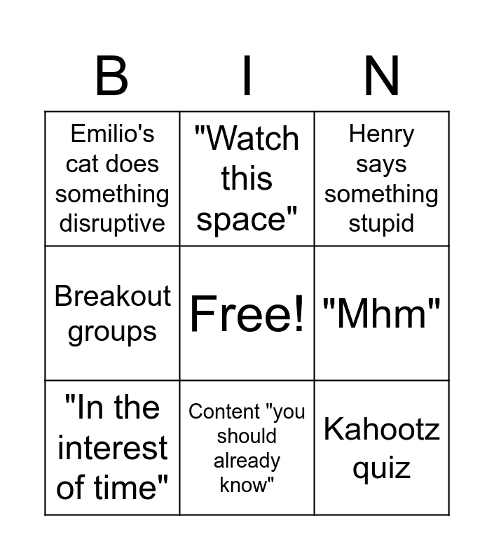 This bingo card has a free space and 8 words: "Mhm", Henry says something stupid, "Watch this space", "In the interest of time", Emilio's cat does something disruptive, Kahootz quiz, Breakout groups and Content "you should already know".