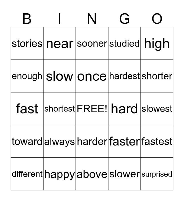 This bingo card has a free space and 24 words: always, happy, once, different, high, stories, enough, near, hard, harder, hardest, fast, faster, fastest, slow, slower, slowest, sooner, shorter, shortest, surprised, toward, studied and above.