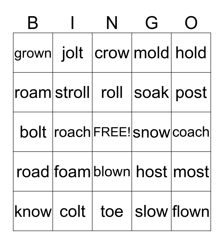 This bingo card has a free space and 24 words: foam, colt, roll, know, hold, grown, roam, jolt, snow, blown, soak, bolt, host, most, stroll, slow, coach, crow, post, roach, flown, road, mold and toe.