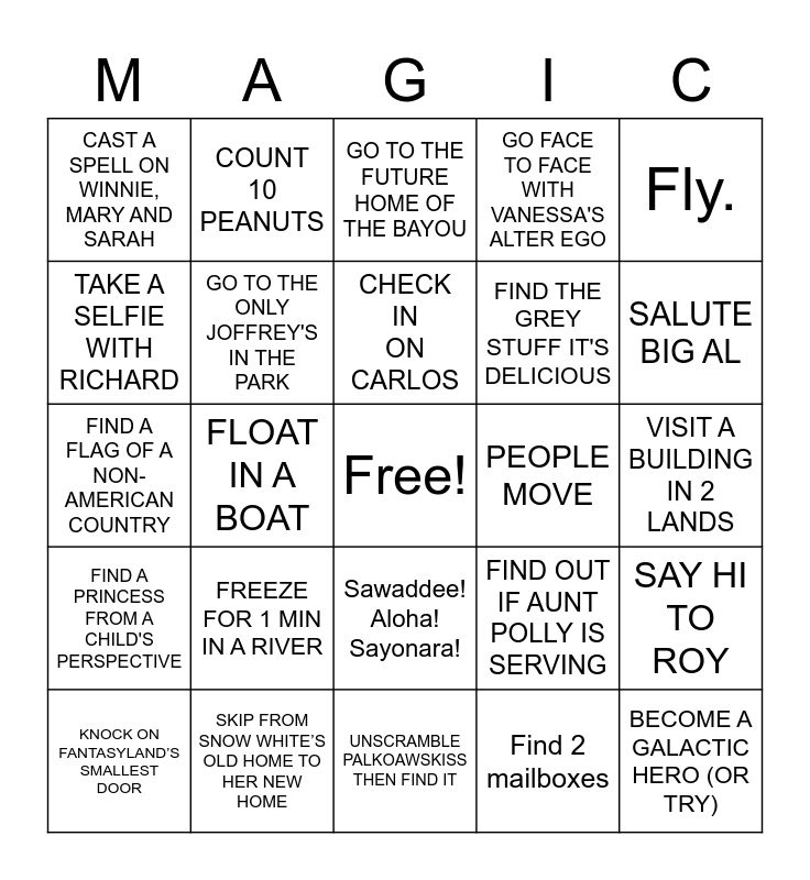 This bingo card has a free space and 24 words: FREEZE FOR 1 MIN IN A RIVER, SKIP FROM SNOW WHITE’S OLD HOME TO HER NEW HOME, CHECK IN ON CARLOS, KNOCK ON FANTASYLAND’S SMALLEST DOOR, Fly., CAST A SPELL ON WINNIE, MARY AND SARAH, TAKE A SELFIE WITH RICHARD, COUNT 10 PEANUTS, PEOPLE MOVE, Sawaddee! Aloha! Sayonara!, FIND THE GREY STUFF IT'S DELICIOUS, FIND A FLAG OF A NON-AMERICAN COUNTRY, FIND OUT IF AUNT POLLY IS SERVING, SAY HI TO ROY, GO TO THE ONLY JOFFREY'S IN THE PARK, Find 2 mailboxes, VISIT A BUILDING IN 2 LANDS, GO TO THE FUTURE HOME OF THE BAYOU, SALUTE BIG AL, FLOAT IN A BOAT, BECOME A GALACTIC HERO (OR TRY), FIND A PRINCESS FROM A CHILD'S PERSPECTIVE, GO FACE TO FACE WITH VANESSA'S ALTER EGO and UNSCRAMBLE PALKOAWSKISS THEN FIND IT.