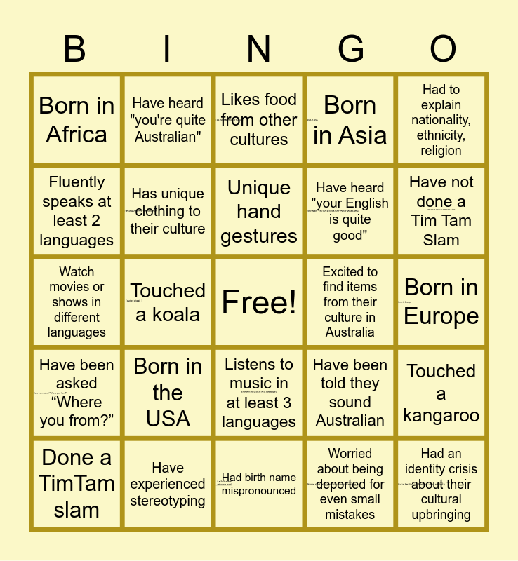 This bingo card has 12 images, a free space and 24 words: Born in the USA, Have experienced stereotyping, Unique hand gestures, Done a TimTam slam, Had to explain nationality, ethnicity, religion, Born in Africa, Fluently speaks at least 2 languages, Have heard "you're quite Australian", Excited to find items from their culture in Australia, Listens to music in at least 3 languages, Have heard "your English is quite good", Watch movies or shows in different languages, Have been told they sound Australian, Touched a kangaroo, Has unique clothing to their culture, Worried about being deported for even small mistakes, Born in Europe, Likes food from other cultures, Have not done a Tim Tam Slam, Touched a koala, Had an identity crisis about their cultural upbringing, Have been asked “Where you from?”, Born in Asia and Had birth name mispronounced.