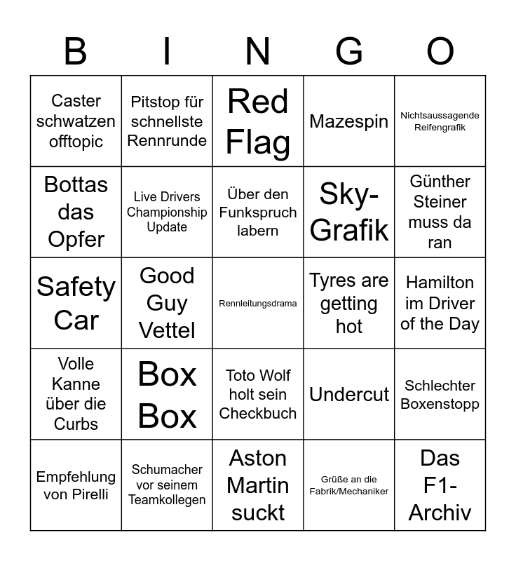 This bingo card has 35 words: Sky-Caster labern Mist, Zeit von Vettel ist vorbei, Hamilton beschwert sich, Live Drivers Championship Update, Toto Wolf holt sein Checkbuch, Mazespin, Bottas das Opfer, Blue Flags für diese Verlierer, Über den Funkspruch labern, Regen vorhergesagt, aber es regnet nicht, Safety Car, Nichtsaussagende Reifengrafik, Zoom auf die Funkanzeigen im Kommandostand, Gefährliche Aktion von Mazepin, Caster schwatzen offtopic, Tyres are getting hot, Grüße an die Fabrik/Mechaniker, Good Guy Vettel, Volle Kanne über die Curbs, Rennleitungsdrama, Undercut, Empfehlung von Pirelli, Schlechter Boxenstopp, Schumacher vor seinem Teamkollegen, Red Flag, Günther Steiner muss da ran, Das F1-Archiv, Ungemutete Sky-Caster, Sky-Grafik, Hamilton im Driver of the Day, Leo die Schildkröte, Aston Martin suckt, Box Box, Pitstop für schnellste Rennrunde and Random Red Bull Dose.