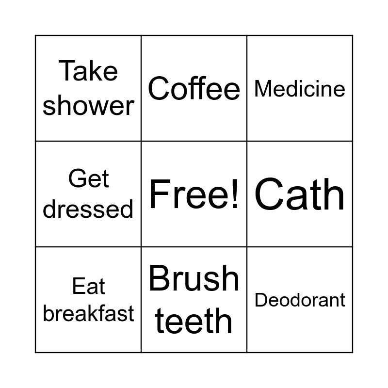 This bingo card has a free space and 8 words: Cath, Medicine, Coffee, Eat breakfast, Take shower, Deodorant, Get dressed and Brush teeth.