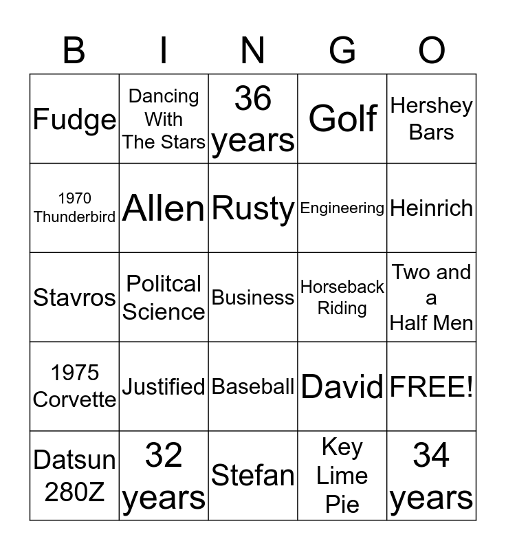 This bingo card has a free space and 24 words: Justified, 32 years, Rusty, Datsun 280Z, Hershey Bars, Fudge, 1970 Thunderbird, Dancing With The Stars, Horseback Riding, Baseball, Engineering, Stavros, David, FREE!, Allen, Key Lime Pie, Two and a Half Men, 36 years, Heinrich, Politcal Science, 34 years, 1975 Corvette, Golf and Stefan.
