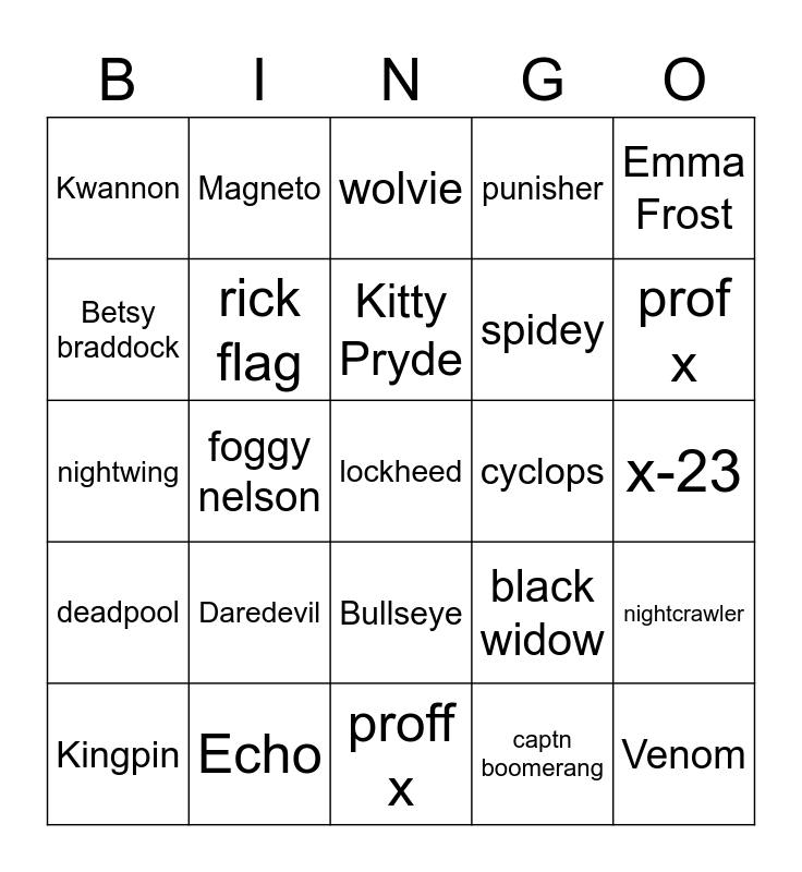This bingo card has a free space and 24 words: Daredevil, Echo, Kitty Pryde, Kingpin, Emma Frost, Kwannon, Betsy braddock, Magneto, cyclops, Bullseye, spidey, nightwing, black widow, nightcrawler, rick flag, captn boomerang, x-23, wolvie, prof x, foggy nelson, Venom, deadpool, punisher and proff x.