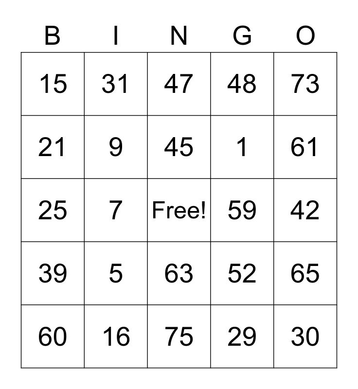 This bingo card has a free space and 24 words: 5, 16, 45, 60, 73, 15, 21, 31, 59, 63, 1, 25, 52, 65, 9, 29, 42, 47, 61, 7, 30, 39, 48 and 75.