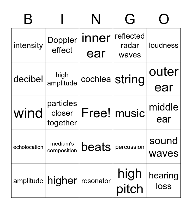 This bingo card has a free space and 24 words: medium's composition, higher, cochlea, amplitude, loudness, intensity, decibel, Doppler effect, music, beats, string, wind, percussion, sound waves, high amplitude, high pitch, middle ear, inner ear, outer ear, particles closer together, hearing loss, echolocation, reflected radar waves and resonator.