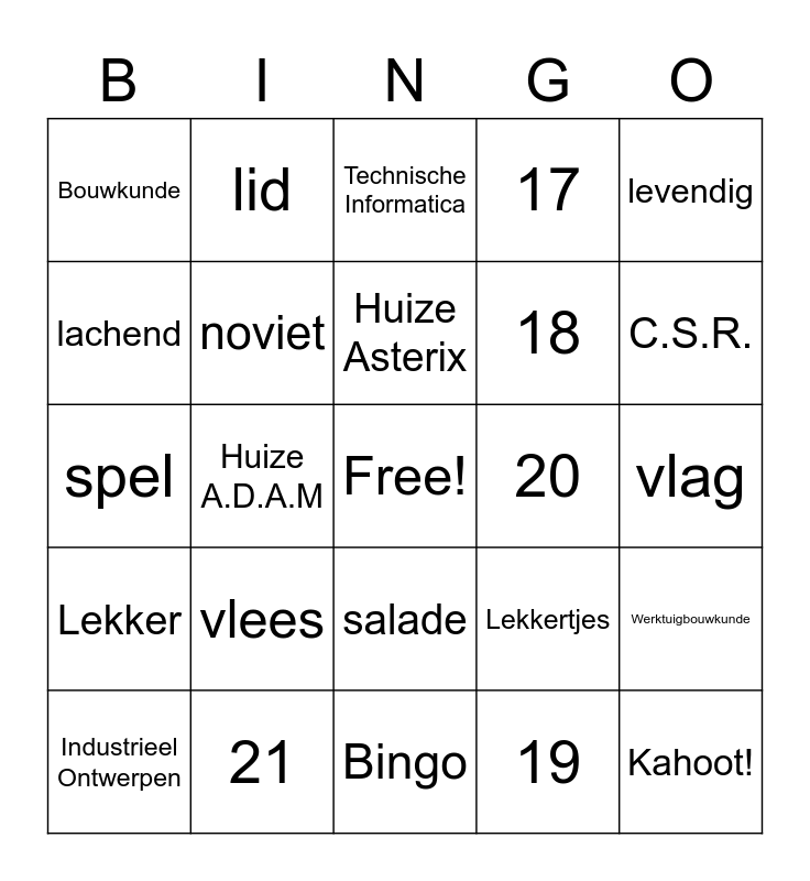 This bingo card has a free space and 24 words: vlees, 21, Huize Asterix, Industrieel Ontwerpen, levendig, Bouwkunde, lachend, lid, 20, salade, 18, spel, Lekkertjes, Werktuigbouwkunde, noviet, 19, vlag, Technische Informatica, C.S.R., Huize A.D.A.M, Kahoot!, Lekker, 17 and Bingo.
