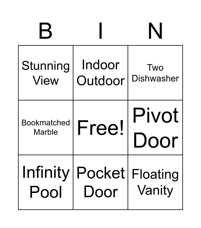 This bingo card has a free space and 8 words: Pivot Door, Two Dishwasher, Indoor Outdoor, Infinity Pool, Stunning View, Floating Vanity, Bookmatched Marble and Pocket Door.