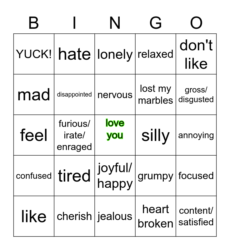 This bingo card has a free space and 34 words: stressed out, heart broken, shy, love it, confused, disappointed, don't like, like, hate, sick, nervous, lonely, depressed, flirt, silly, gross/ disgusted, cherish, feel, tired, grumpy, joyful/ happy, bored, YUCK!, annoying, jealous, content/ satisfied, relaxed, paranoid, lost my marbles, mad, angry, furious/ irate/ enraged, focused and Awed/ Wowed.