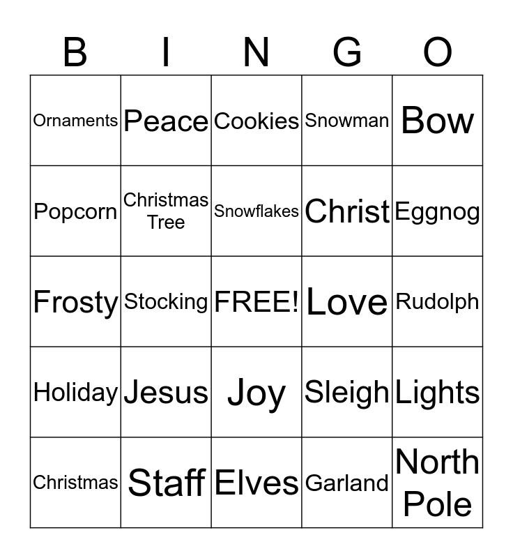 This bingo card has a free space and 24 words: Jesus, Staff, Snowflakes, Christmas, Bow, Ornaments, Popcorn, Peace, Love, Joy, Christ, Frosty, Sleigh, Lights, Christmas Tree, Garland, Rudolph, Cookies, Eggnog, Stocking, North Pole, Holiday, Snowman and Elves.