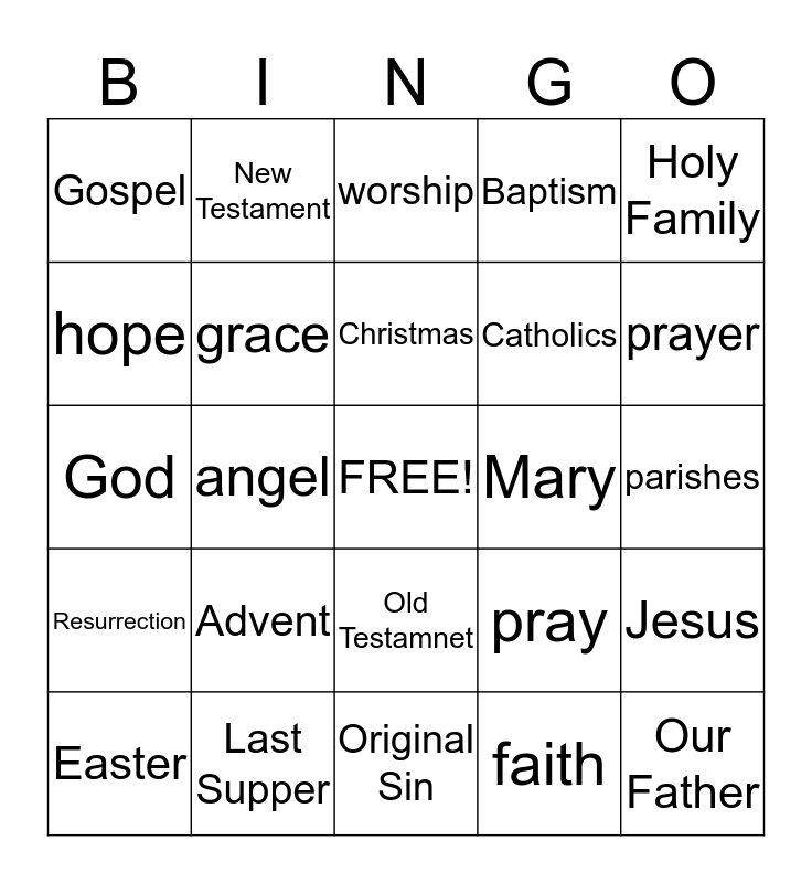 This bingo card has a free space and 47 words: saint, Our Father, Bible, Original Sin, Advent, Reconciliation, New Testament, divine, hope, Eucharist, grace, Baptism, Jesus, pray, Sign of the Cross, Pope, Christmas, Mary, Hail Mary, Holy Family, angel, faith, Gospel, Catholics, Holy Spirit, prayer, Easter, sacrament, Old Testamnet, Resurrection, Blessed Trinity, Penance, Holy Communion, disciples, Church, Last Supper, parishes, Body and Blood, Lent, forgiven, Act of Contrion, worship, God, Apostles, Ten Commandments, Mass and love.