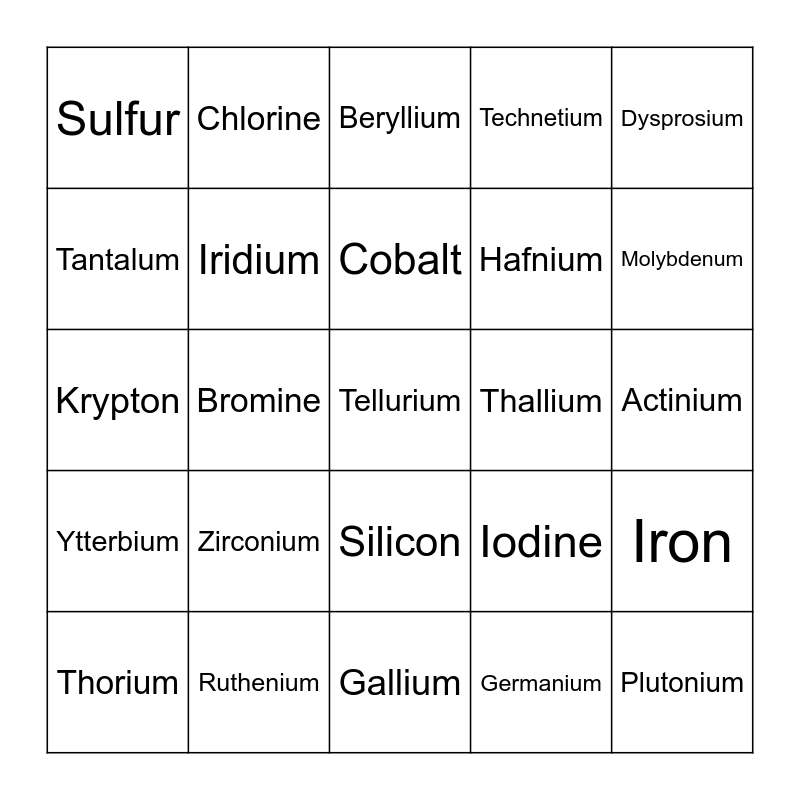 This bingo card has 99 words: Hydrogen, Helium, Lithium, Beryllium, Boron, Carbon, Nitrogen, Oxygen, Fluorine, Neon, Sodium, Magnesium, Aluminum, Silicon, Phosphorous, Sulfur, Chlorine, Argon, Potassium, Calcium, Scandium, Titanium, Vanadium, Chromium, Manganese, Iron, Cobalt, Nickel, Copper, Zinc, Gallium, Germanium, Arsenic, Selenium, Bromine, Krypton, Rubidium, Strontium, Yttrium, Zirconium, Niobium, Molybdenum, Technetium, Ruthenium, Rhodium, Palladium, Silver, Cadmium, Indium, Tin, Antimony, Tellurium, Iodine, Xenon, Cesium, Barium, Lanthanum, Cerium, Praseodymium, Neodymium, Promethium, Samarium, Europium, Gadolinium, Terbium, Dysprosium, Holmium, Erbium, Thulium, Ytterbium, Lutetium, Hafnium, Tantalum, Tungsten, Rhenium, Osmium, Iridium, Platinum, Gold, Mercury, Thallium, Lead, Bismuth, Polonium, Astatine, Radon, Francium, Radium, Actinium, Thorium, Uranium, Neptunium, Plutonium, Americium, Curium, Californium, Einsteinium, Nobelium and Rutherfordium.