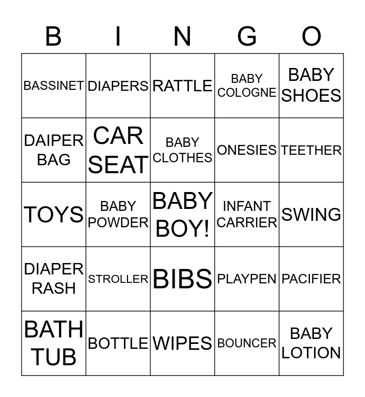 This bingo card has a free space and 24 words: STROLLER, BOTTLE, BABY CLOTHES, BATH TUB, BABY SHOES, BASSINET, DAIPER BAG, DIAPERS, INFANT CARRIER, BIBS, ONESIES, TOYS, PLAYPEN, PACIFIER, CAR SEAT, BOUNCER, SWING, RATTLE, TEETHER, BABY POWDER, BABY LOTION, DIAPER RASH, BABY COLOGNE and WIPES.