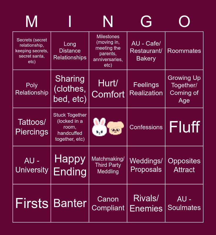 This bingo card has a free space and 24 words: Happy Ending, Banter, Hurt/ Comfort, Firsts, Roommates, Secrets (secret relationship, keeping secrets, secret santa, etc), Poly Relationship, Long Distance Relationships, Confessions, Matchmaking/ Third Party Meddling, Feelings Realization, Tattoos/ Piercings, Weddings/ Proposals, Opposites Attract, Sharing (clothes, bed, etc), Rivals/ Enemies, Fluff, Milestones (moving in, meeting the parents, anniversaries, etc), Growing Up Together/ Coming of Age, Stuck Together (locked in a room, handcuffed together, etc), AU - Soulmates, AU - University, AU - Cafe/ Restaurant/ Bakery and Canon Compliant.