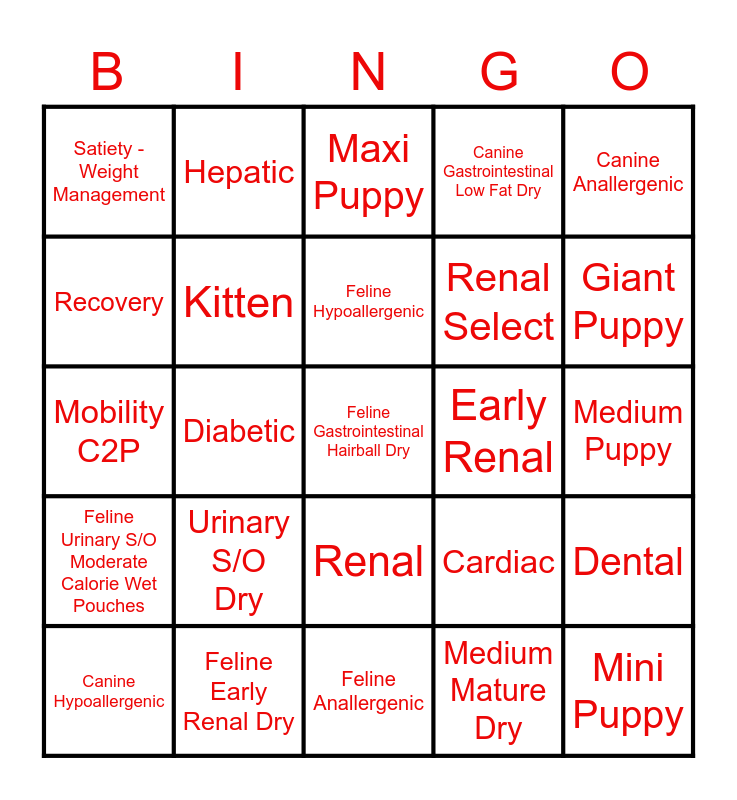 This bingo card has 25 words: Urinary S/O Dry, Feline Anallergenic, Feline Hypoallergenic, Canine Hypoallergenic, Canine Anallergenic, Satiety - Weight Management, Recovery, Hepatic, Early Renal, Renal, Renal Select, Mobility C2P, Cardiac, Dental, Kitten, Mini Puppy, Medium Puppy, Maxi Puppy, Giant Puppy, Diabetic, Feline Gastrointestinal Hairball Dry, Feline Early Renal Dry, Feline Urinary S/O Moderate Calorie Wet Pouches, Canine Gastrointestinal Low Fat Dry and Medium Mature Dry.