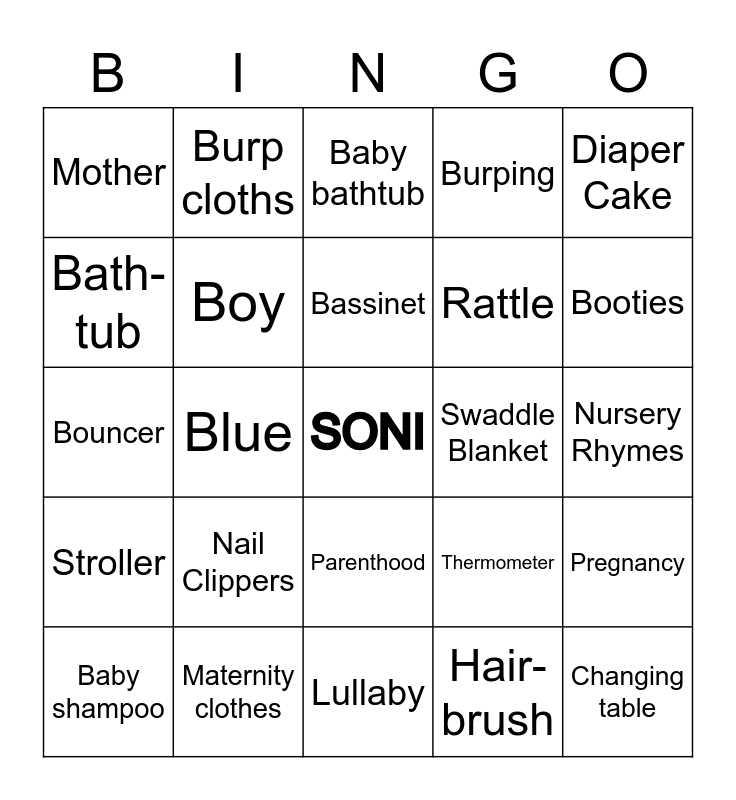 This bingo card has a free space and 74 words: SONI, Baby, Baby bathtub, Baby Food, Baby Lotion, Baby monitors, Baby ointment, Baby powder, Baby shampoo, Baby Shower, Baby Sitter, Baby Socks, Bassinet, Bath-tub, Blankets, Blue, Books, Booties, Bottles, Bouncer, Boy, Burp cloths, Burping, Car seat, Changing table, Cradle, Cravings, Crib, Daddy-2-be, Diaper bag, Diaper Cake, Diaper Pin, Diapers, Formula, Girl, Hair-brush, High chair, Hugs, Humidifier, Infant carrier, Lullaby, Maternity clothes, Milk, Mittens, Mommy-2-be, Mother, Motherhood, Nail Clippers, Nappies, New-born, Night light, Nursery, Nursery Rhymes, Nursing, Onesies, Pacifier, Parenthood, Play mat, Pram, Pregnancy, Rattle, Shower, Stroller, Stuffed animals, Swaddle Blanket, Swing, Teddy Bear, Teething rings, Thermometer, Toddler, Toys, Ultrasound, Walker and Wash Cloth.