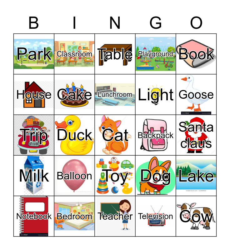 This bingo card has 24 images, a free space and 24 words: Balloon, Bedroom, Lunchroom, Notebook, Book, Park, House, Classroom, Backpack, Toy, Light, Trip, Dog, Lake, Cake, Television, Santa claus, Table, Goose, Duck, Cow, Milk, Playground and Teacher.