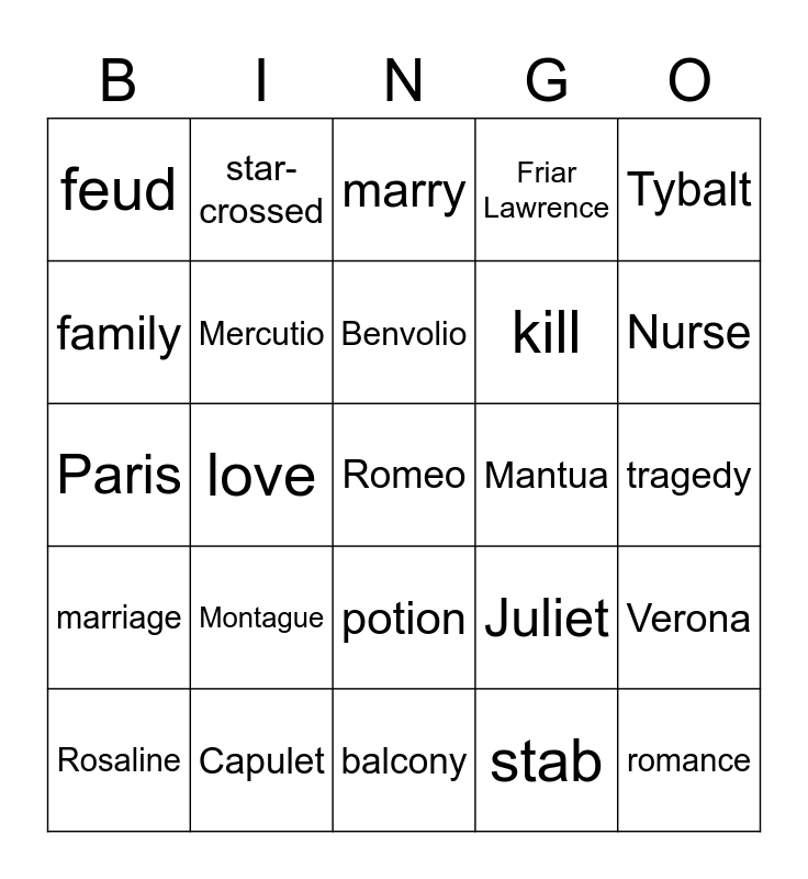 This bingo card has a free space and 24 words: Montague, Capulet, Benvolio, Rosaline, Tybalt, feud, family, star-crossed, Mantua, potion, kill, Paris, Juliet, Verona, Mercutio, stab, tragedy, marry, Nurse, love, romance, marriage, Friar Lawrence and balcony.