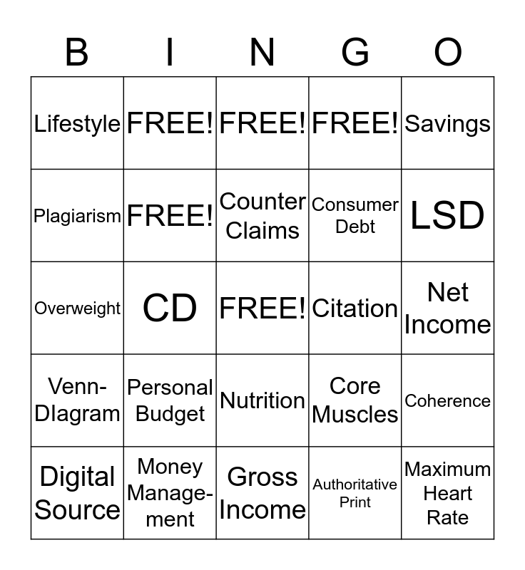 This bingo card has a free space and 24 words: Personal Budget, Money Manage-ment, Counter Claims, Digital Source, Savings, Lifestyle, Plagiarism, FREE!, Citation, Nutrition, Consumer Debt, Overweight, Core Muscles, Coherence, FREE!, Authoritative Print, Net Income, FREE!, LSD, CD, Maximum Heart Rate, Venn-DIagram, FREE! and Gross Income.