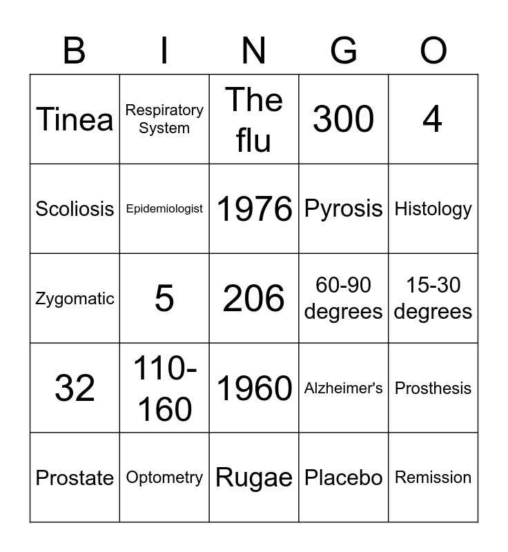 This bingo card has 41 words: Verrucae, Zygomatic, Otolaryngology, Epidemiologist, Optometry, 1960, 1976, 10, 4, 32, 5, 300, 206, 15-30 degrees, 60-90 degrees, 110-160, 60-100, Tinea, Ecchymosis, The flu, Prosthesis, Remission, Rugae, Pyrosis, Process, Tinnitus, Placebo, Femur, Histology, Pericardium, 650+, Respiratory System, Prostate, Stroke, Alzheimer's, Scoliosis, Cholecystectomy, white blood cells or leukocytes, Hiccups, Athletes Foot and The lens.