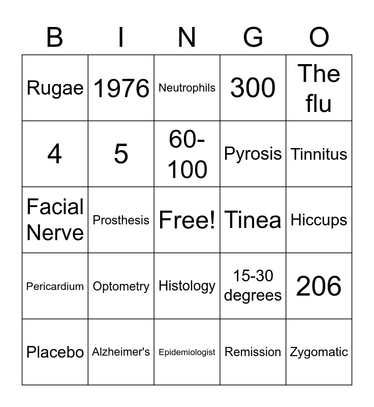 This bingo card has a free space and 49 words: Verrucae, Zygomatic, Otolaryngology, Epidemiologist, Optometry, 1960, 1976, 10, 4, 32, 5, 300, 206, 15-30 degrees, 60-90 degrees, 110-160, 60-100, Tinea, Ecchymosis, The flu, Prosthesis, Remission, Rugae, Pyrosis, Process, Tinnitus, Placebo, Femur, Histology, Pericardium, 650+, Respiratory System, Prostate, Stroke, Alzheimer's, Scoliosis, Cholecystectomy, white blood cells or leukocytes, Hiccups, Athletes Foot, The Lens, Corpus Callosum, Umbilicus, Nucleus, Facial Nerve, Neutrophils, Hemoglobin, Phalanges and Arteries.