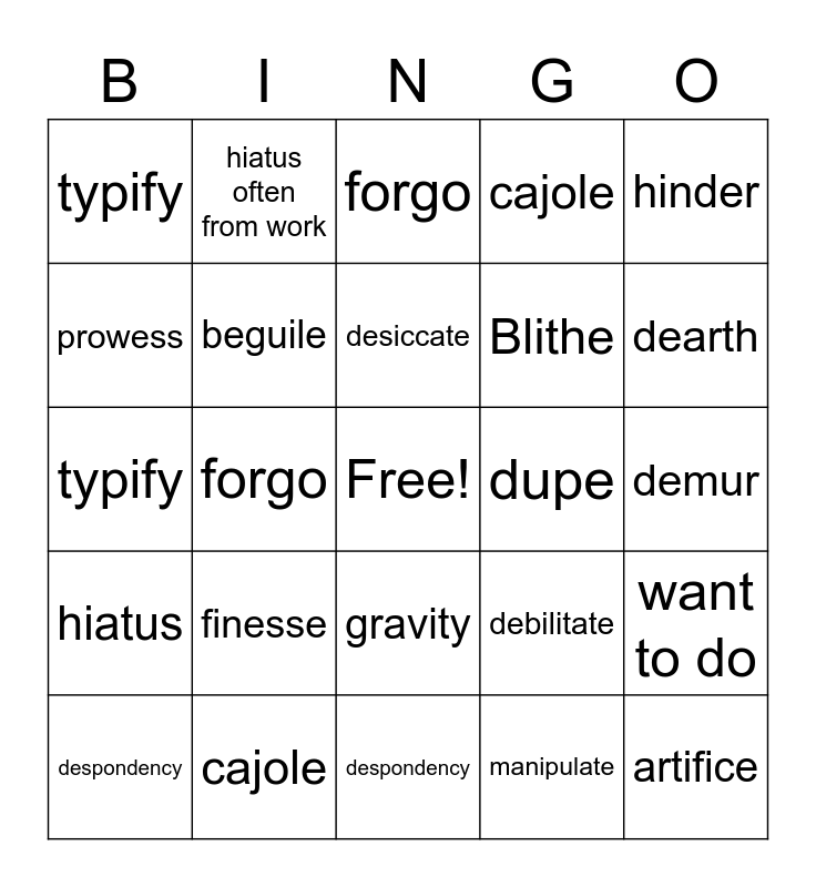 This bingo card has a free space and 48 words: typify, artifice, dearth, despondency, finesse, gravity, hiatus often from work, malaise, prowess, qualm, beguile, cajole, want to do, debilitate, decimate, demur, desiccate, dupe, engender, hinder, forgo, manipulate, typify, Blithe, artifice, dearth, despondency, finesse, gravity, hiatus, malaise, prowess, qualm, beguile, cajole, debilitate, decimate, demur, desiccate, dupe, engender, fetter, forgo, manipulate, typify, apprehensive, arduous and blithe.