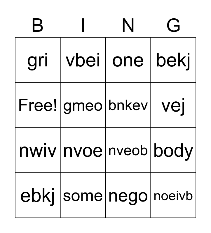 This bingo card has 16 words: some, body, one, gri, nwiv, vbei, nveob, nego, Free!, gmeo, ebkj, bekj, nvoe, vej, bnkev and noeivb.