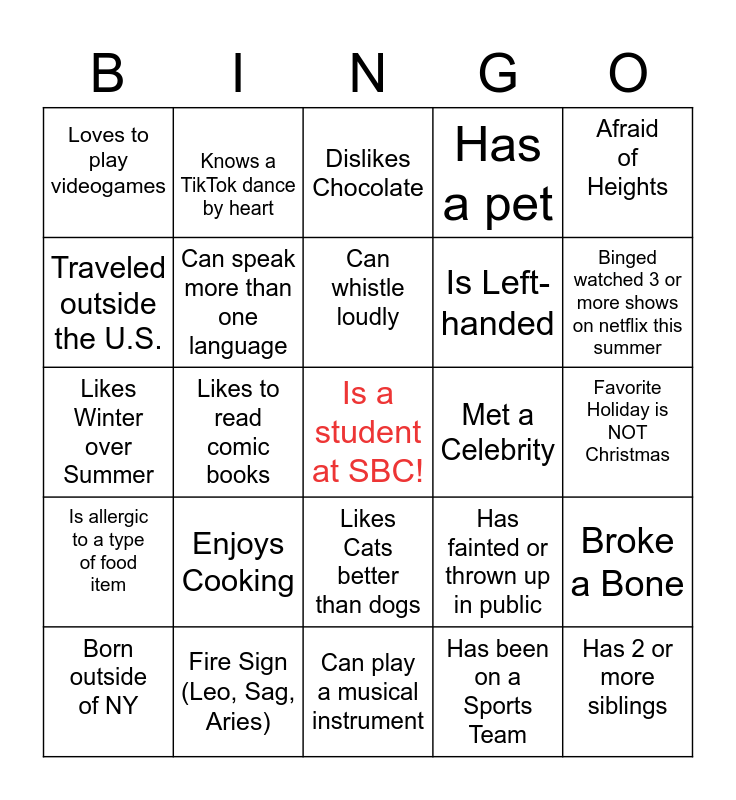 This bingo card has a free space and 24 words: Enjoys Cooking, Fire Sign (Leo, Sag, Aries), Can whistle loudly, Born outside of NY, Afraid of Heights, Loves to play videogames, Traveled outside the U.S., Knows a TikTok dance by heart, Met a Celebrity, Likes Cats better than dogs, Is Left-handed, Likes Winter over Summer, Has fainted or thrown up in public, Broke a Bone, Can speak more than one language, Has been on a Sports Team, Favorite Holiday is NOT Christmas, Dislikes Chocolate, Binged watched 3 or more shows on netflix this summer, Likes to read comic books, Has 2 or more siblings, Is allergic to a type of food item, Has a pet and Can play a musical instrument.