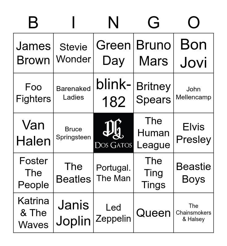 This bingo card has a free space and 38 words: 311, Avril Lavigne, The B-52's, Barenaked Ladies, Beastie Boys, The Beatles, blink-182, Bob Seger, Bon Jovi, Britney Spears, Bruce Springsteen, Bruno Mars, The Chainsmokers & Halsey, Elvis Presley, Foo Fighters, Foster The People, Gorillaz, Green Day, Guns N' Roses, The Human League, James Brown, Janis Joplin, John Mellencamp, Katrina & The Waves, Kid Rock, Led Zeppelin, Madonna & Justin Timberlake, Neil Diamond, No Doubt, One Direction, Pearl Jam, Portugal. The Man, Queen, Stevie Wonder, Sublime, The Ting Tings, Van Halen and Walk The Moon.