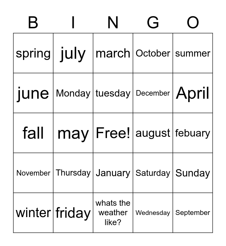 This bingo card has a free space and 24 words: Thursday, friday, tuesday, winter, summer, spring, june, july, august, January, December, fall, Saturday, Sunday, Monday, Wednesday, febuary, march, April, may, September, November, October and whats the weather like?.