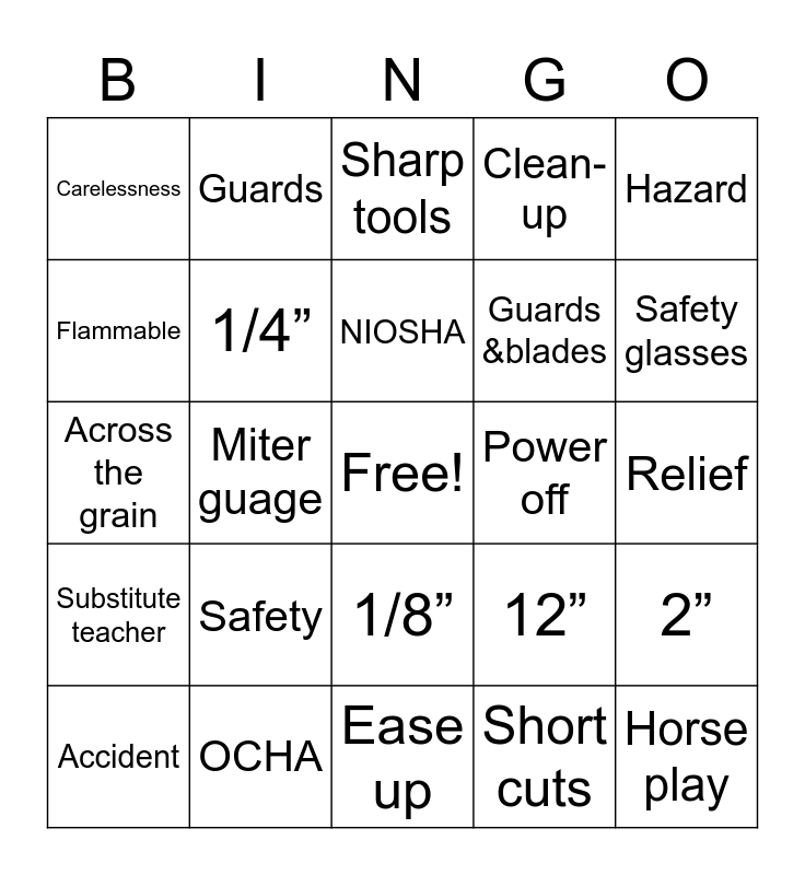 This bingo card has a free space and 24 words: Safety, OCHA, NIOSHA, Accident, Hazard, Carelessness, Flammable, Guards, Power off, 1/8”, Guards &blades, Across the grain, 12”, 2”, 1/4”, Short cuts, Relief, Sharp tools, Safety glasses, Miter guage, Horse play, Substitute teacher, Clean-up and Ease up.