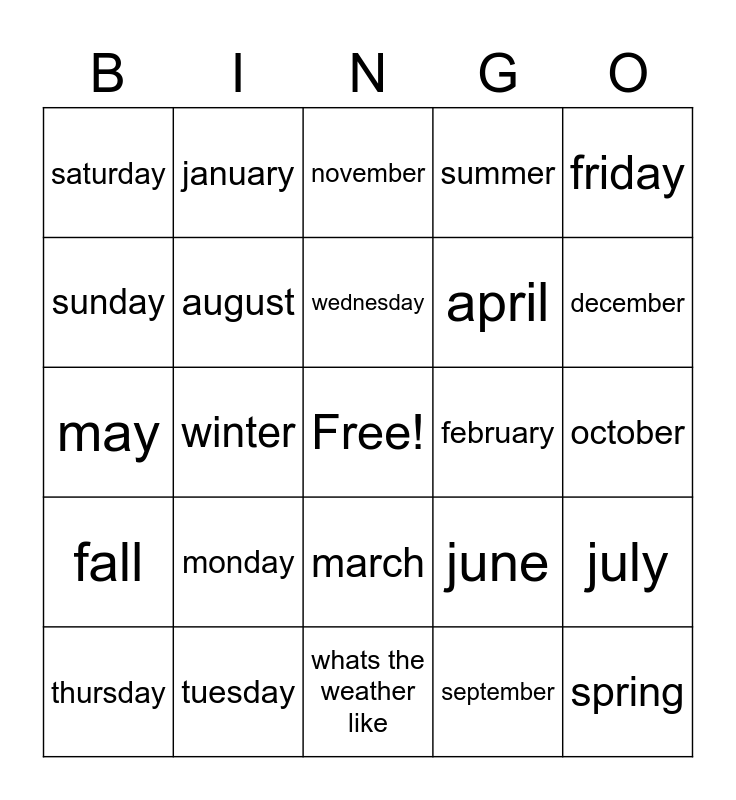 This bingo card has a free space and 24 words: monday, tuesday, wednesday, thursday, friday, saturday, sunday, january, february, march, april, may, june, july, august, september, october, november, december, winter, spring, fall, summer and whats the weather like.