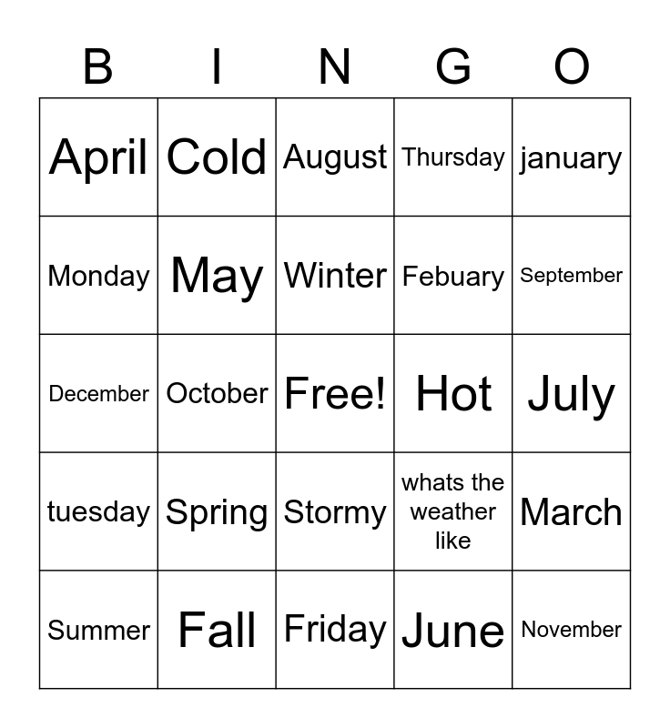 This bingo card has a free space and 24 words: Spring, Fall, Winter, Summer, january, April, Monday, Cold, Hot, Stormy, Febuary, December, whats the weather like, March, May, June, July, August, September, October, November, tuesday, Thursday and Friday.