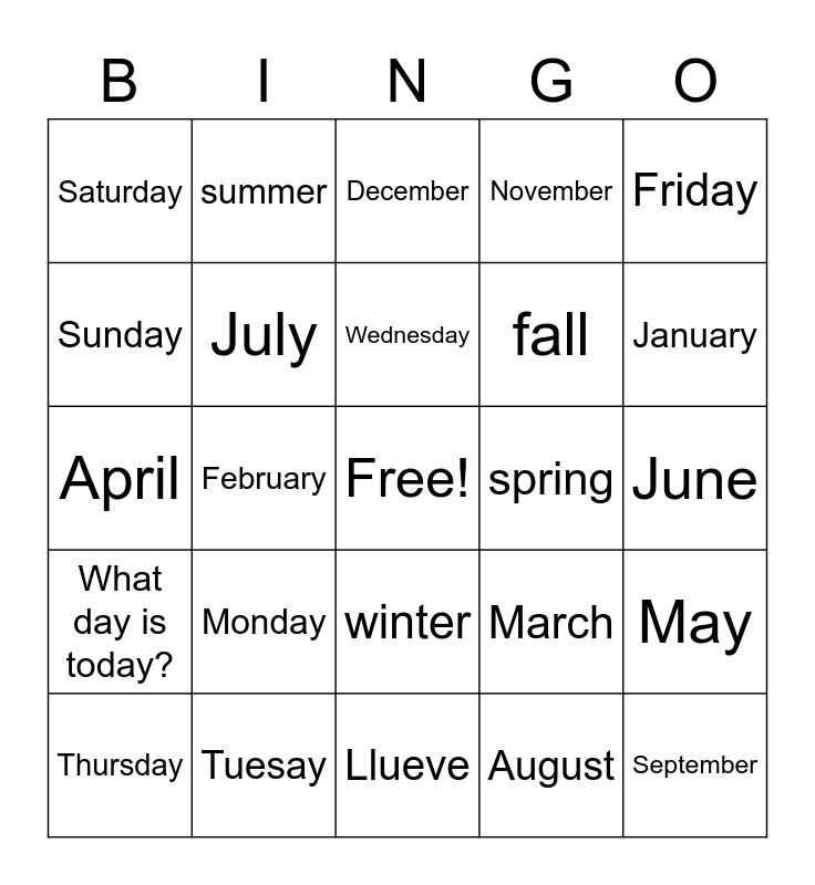 This bingo card has a free space and 24 words: Monday, Tuesay, Wednesday, Thursday, Friday, Saturday, Sunday, summer, spring, winter, fall, April, March, May, July, August, June, December, January, February, September, What day is today?, November and Llueve.